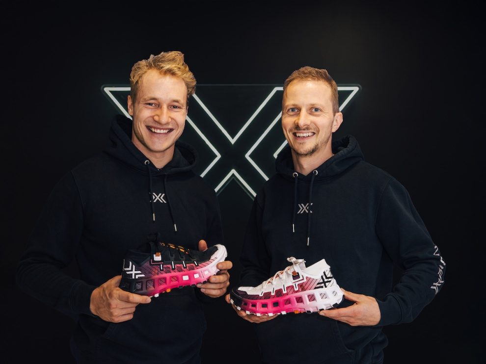 Nella foto Marco Odermatt a fianco di Maximilian Lenk mostrano la calzatura Terraskin, l’ultima innovazione nata in casa X-BIONIC, una scarpa da trail running innovativa e sviluppata dal proprio centro di ricerca di Montebelluna.