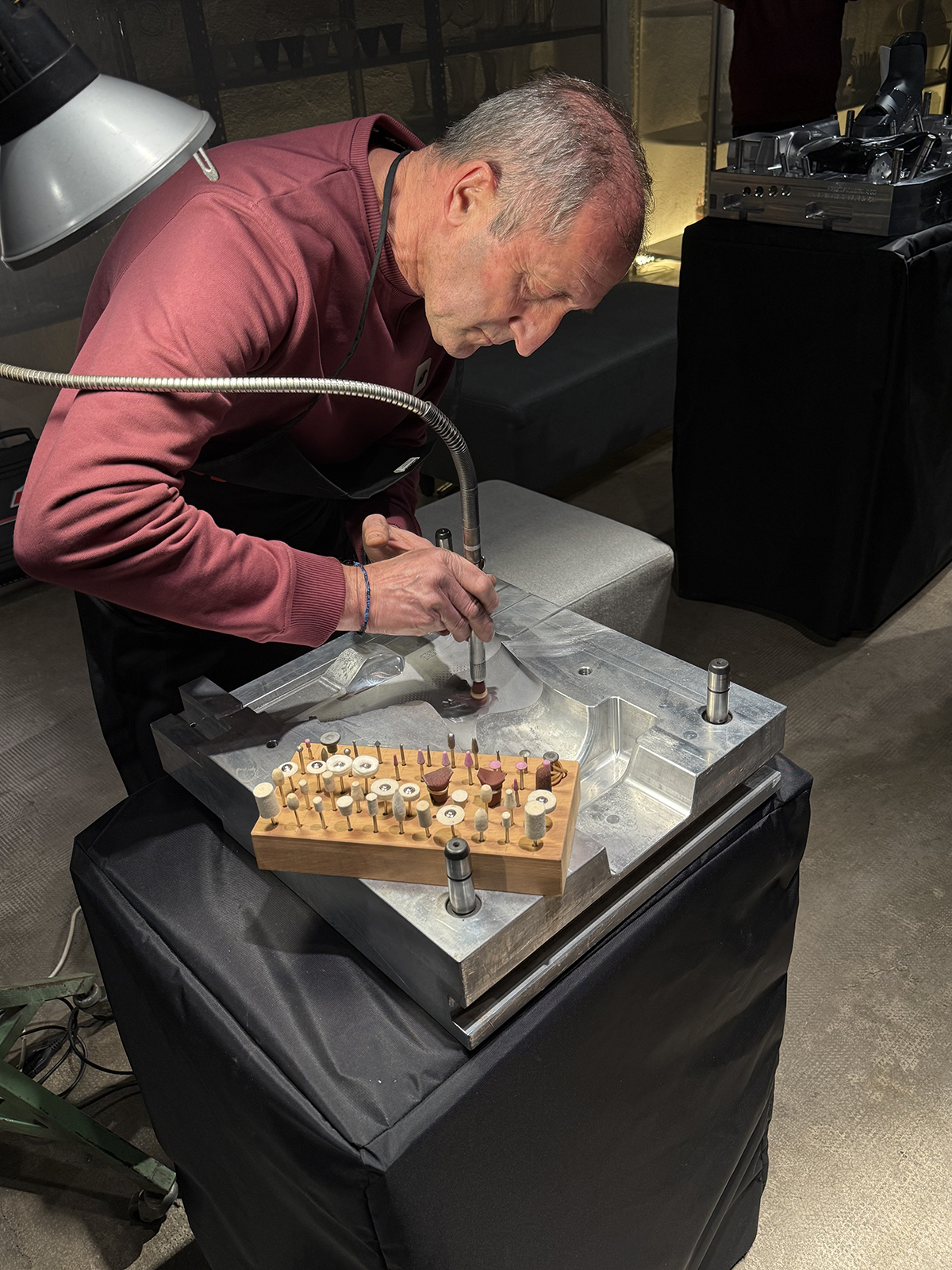 Zoran invita a toccare con mano i materiali alla base di questo processo: i granuli plastici, neutri e colorati, e soprattutto lo stampo originale del Promachine 3, nel quale i materiali fusi sono iniettati. Un processo industriale che mantiene una componente manuale: lo stampo, soggetto a usura, è periodicamente ripristinato a mano, come dimostra dal vivo da un tecnico dell’azienda. Abituali alla tecnologia persistenza, dinnanzi a quel tecnico sembra che il mondo si sia fermato!