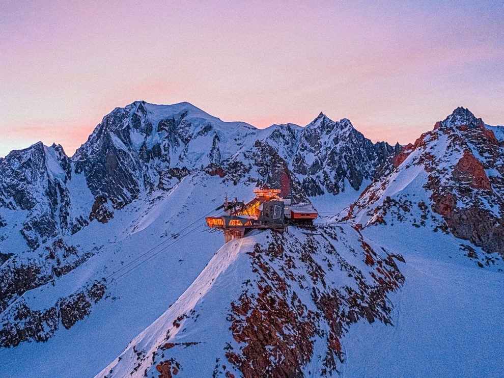 A Punta Helbronner si fa aperitivo davanti a una distesa di vette altissime, tra i ghiacciai accesi dai colori del tramonto, in un silenzio irreale: un momento indimenticabile.