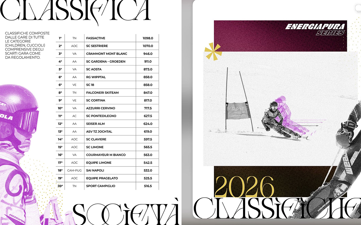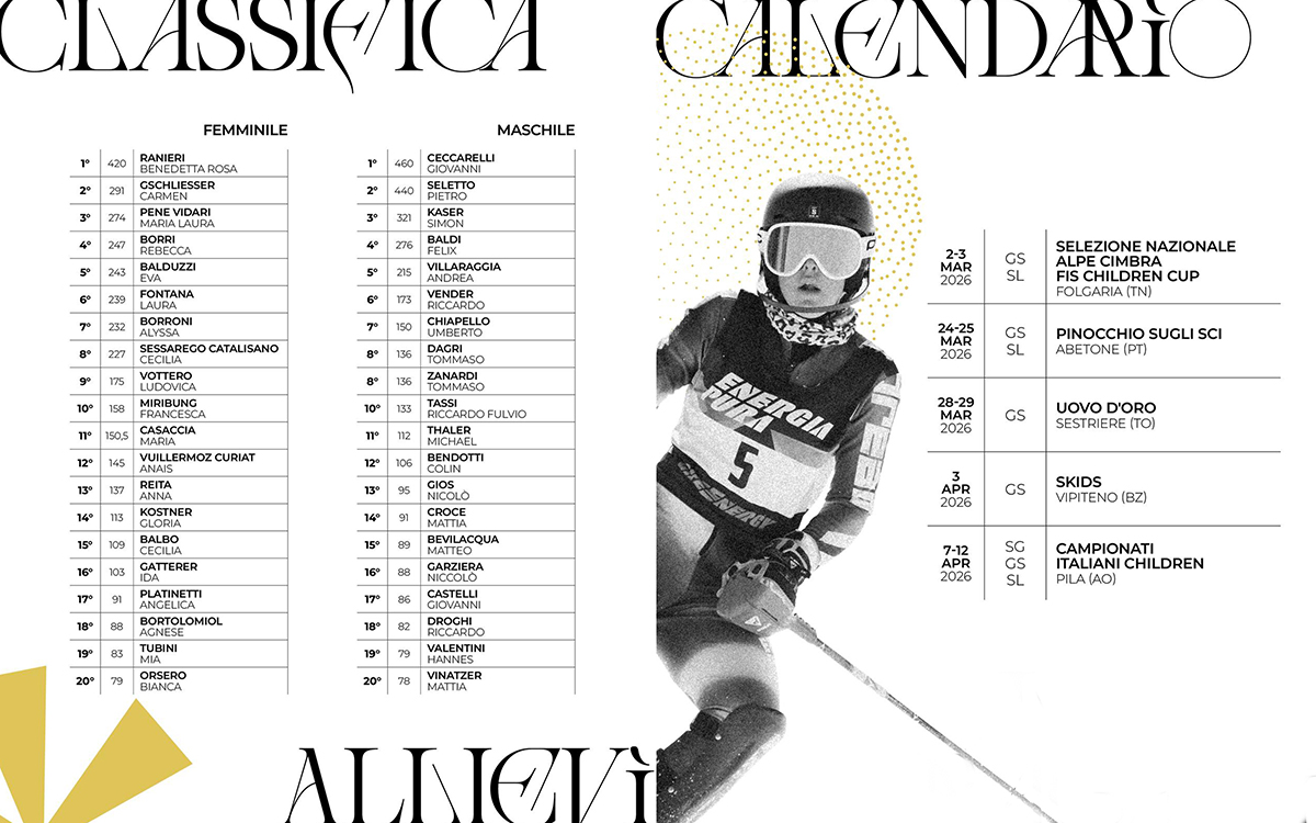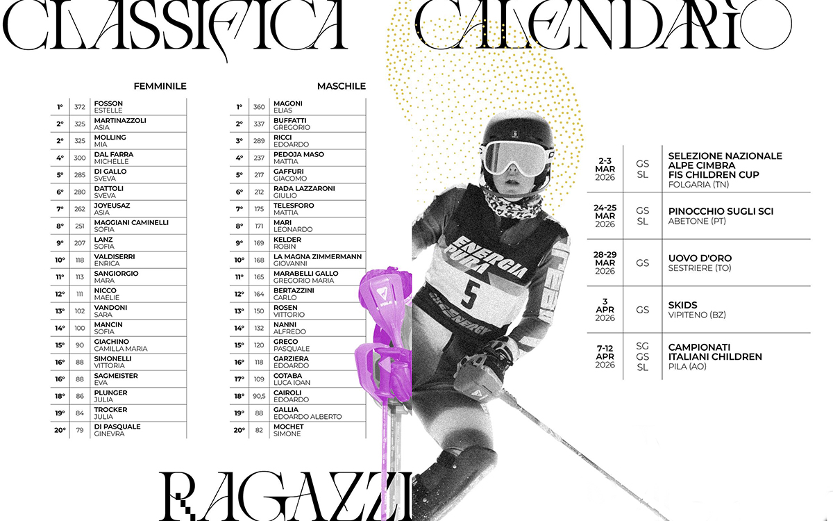 Per Ragazzi e Allievi, l’Energiapura Children Series ha attribuito maggiore rilevanza alle principali competizioni nazionali (Alpe Cimbra FIS Children Cup, Campionati Italiani e Pinocchio), lasciando invariato il punteggio di queste prove e dimezzando quello delle altre. La classifica ha considerato i cinque migliori risultati su nove gare complessive, valorizzando la gestione del percorso stagionale e alleggerendo il peso della singola prestazione.