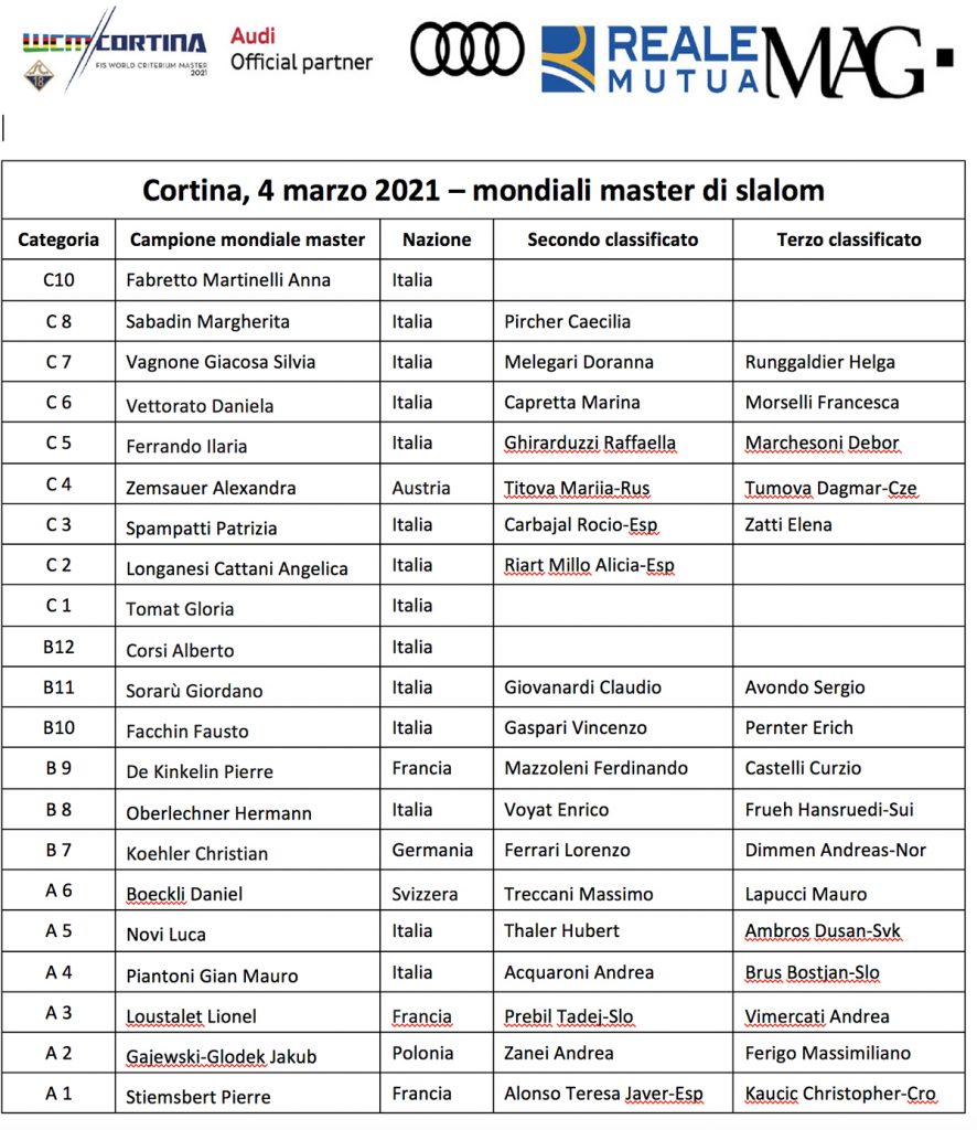 Nella seguente tabella ci sono i Campioni Mondiali Master 2021, gli italiani riceveranno il distintivo FISI che li riconosce appartenenti alla Rappresentativa Nazionale Master. I nominativi senza l’indicazione della nazione sono da intendersi italiani. Mondiali Master a Cortina Mondiali Master a Cortina Mondiali Master a Cortina