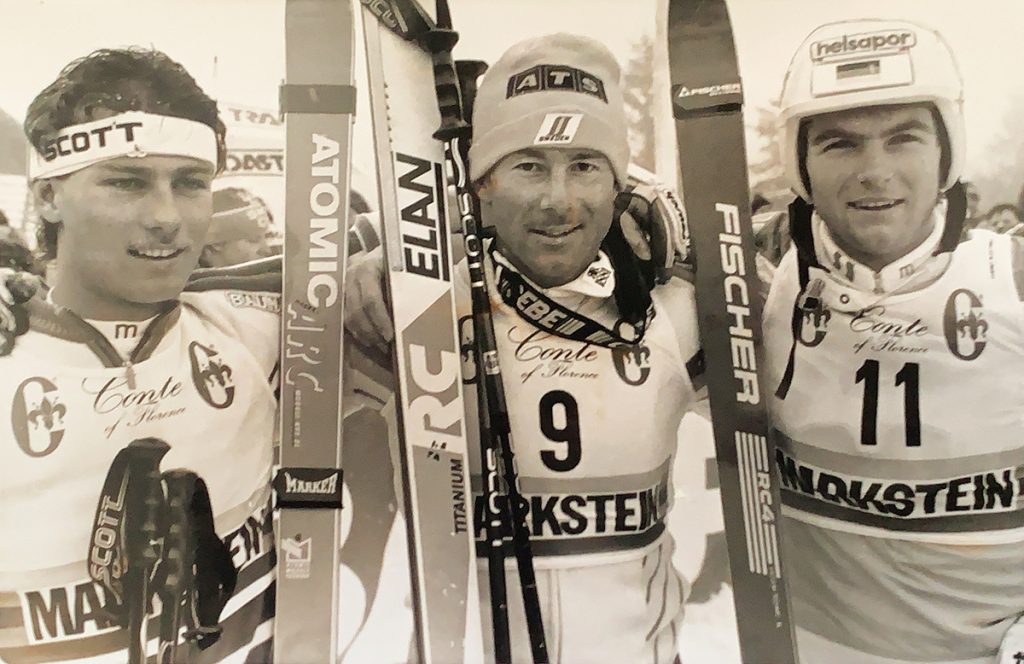 Lo svedese e lo staff tecnico della Elan. A sinistra l’ingegnere Andrej Robic (ricercatore), a destra Jurij Vogelnik, il suo fidato skiman