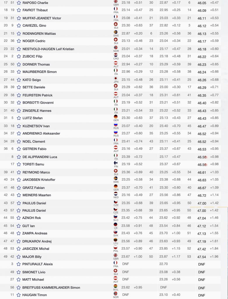 A 12/100 Gino Caviezel, a 16 Christian Hirschbuehl a 19 il sorprendente inglese Charlie Raposo (poi finito 17esimo!). Simon Maurberger, sullo stesso percorso è 22esimo (+0,58).