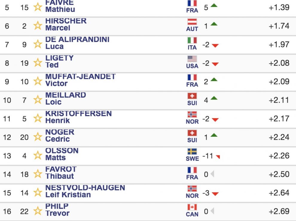 Luca De Aliprandini non è riuscito a replicare la sua splendida prima manche chiusa al quinto posto. Con uno dei peggiori tempi, nonostante una prima parte niente male, nella seconda è sceso al settimo posto. Un risultato comunque che regala un poco di fiducia per una stagione dove i gigantisti Azzurri hanno davvero fatto una fatica a dir poco inattesa.