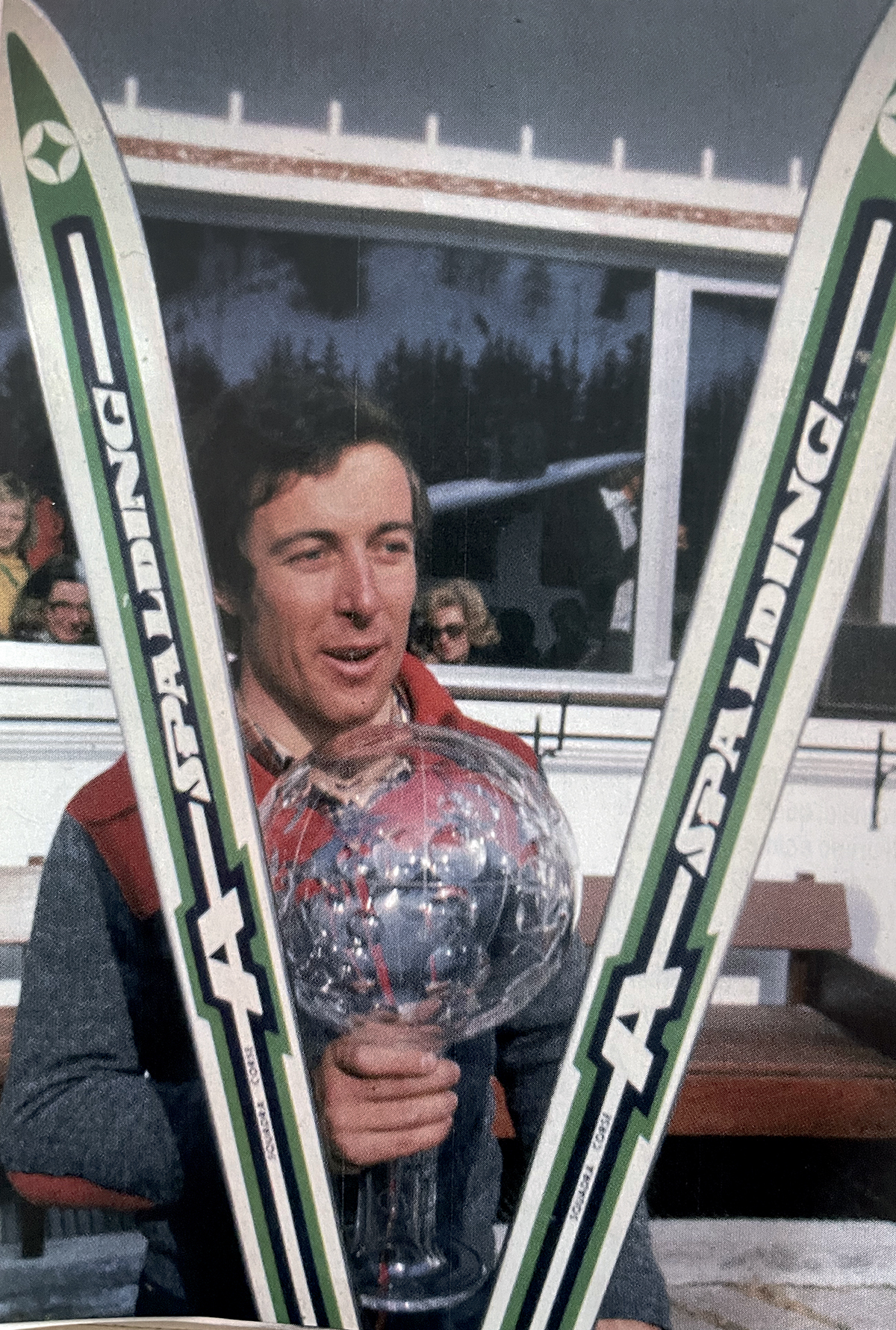 Gustav Thöni con la Sfera di Cristallo vinta nel 1975 dopo il mitico parallelo di Ortisei. Gli Alfa 450 della Spalding erano, assieme ai Roc Competition della Rossignol, ai C4 Fischer e ai Maxel gli sci più utilizzati dalla Valanga