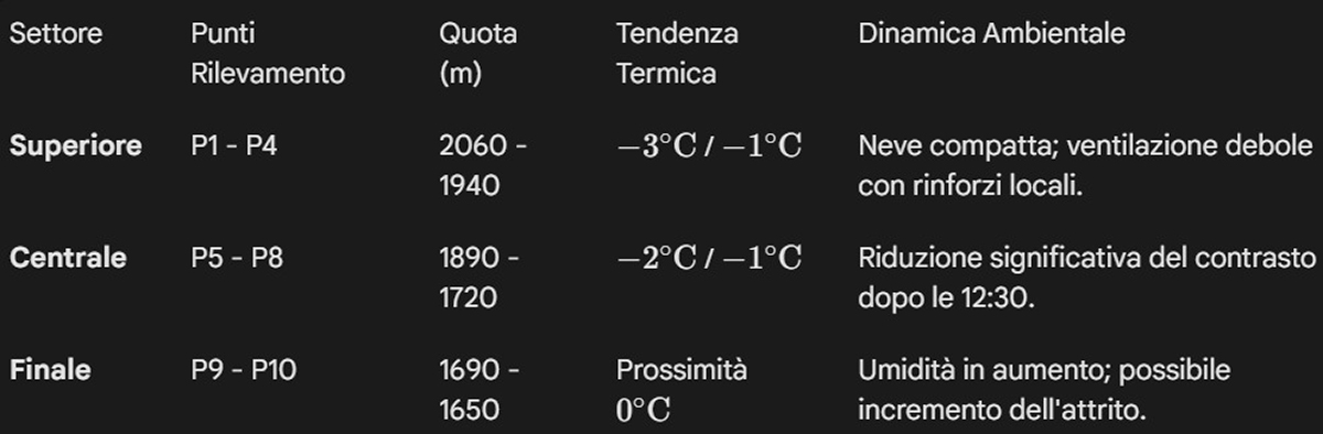 Il gradiente termico lungo i 400 metri di dislivello della pista evidenzia una transizione importante. Mentre la parte alta mantiene temperature saldamente negative, garantendo una coesione del manto ottimale, il settore di Rumerlo (P10) si attesta su valori prossimi allo zero termico. In concomitanza con un’umidità relativa del 70-74%, è prevedibile un incremento dell’attrito superficiale per le atlete con pettorale alto. La gestione della struttura della soletta sarà determinante per conservare la velocità accumulata nei tratti di scorrimento finali.