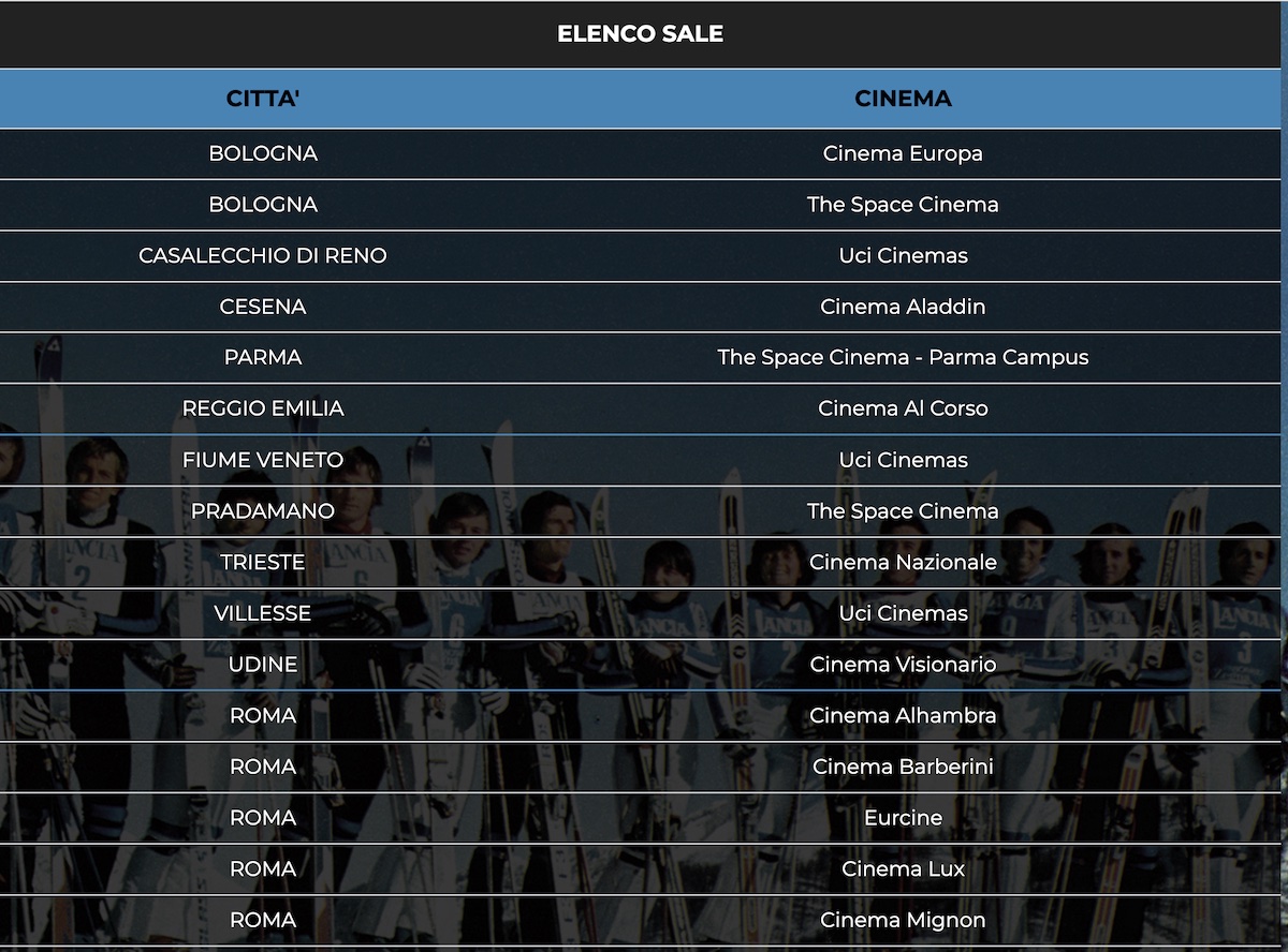 Questo l’elenco completo delle sale dove uscirà il docufilm