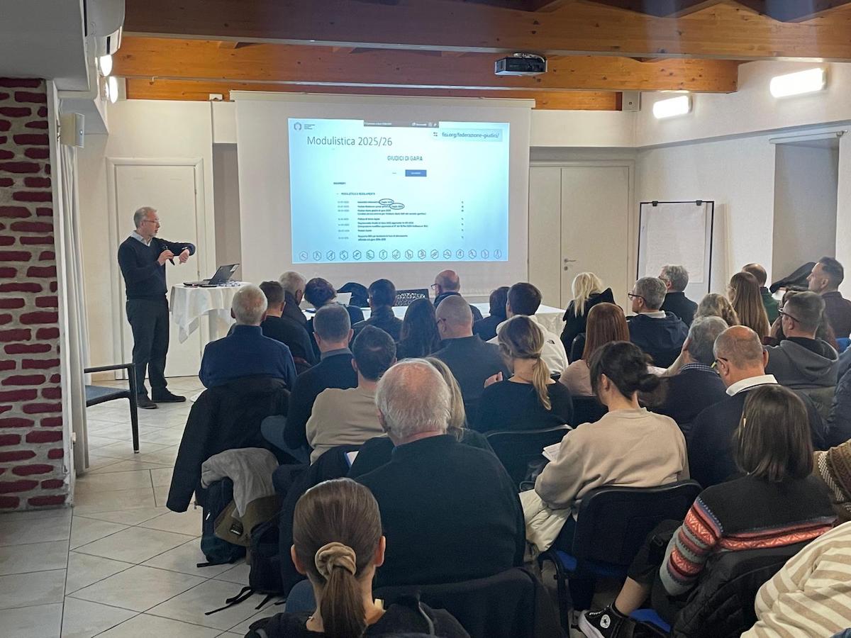 Il corso ha offerto un valore aggiunto fondamentale: la possibilità di un confronto diretto con relatori di altissimo livello. Tra questi, Ivan Nicco della Scuola Tecnici Federali FISI, la giudice internazionale Elena Gaja, e Alberto Senigagliesi, Race Director della Coppa del Mondo femminile. Domande, dubbi, casi concreti e scambi di esperienza hanno riempito la sala e dato profondità al programma.