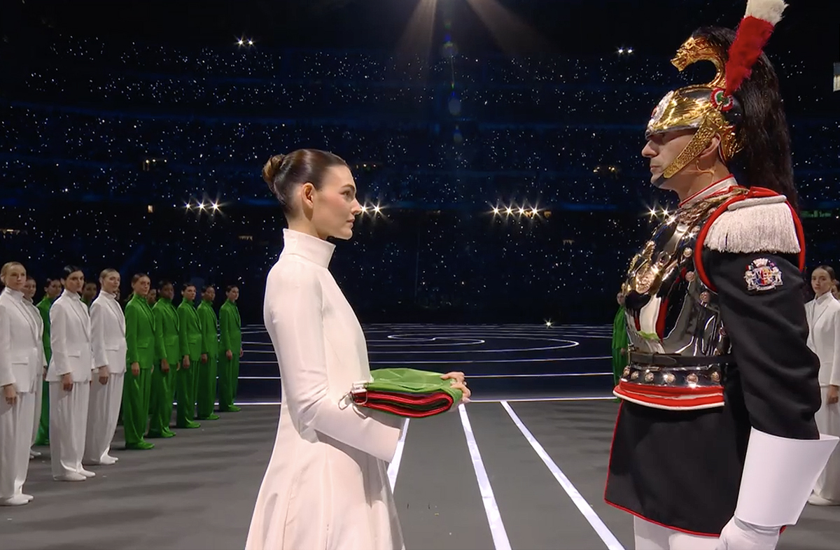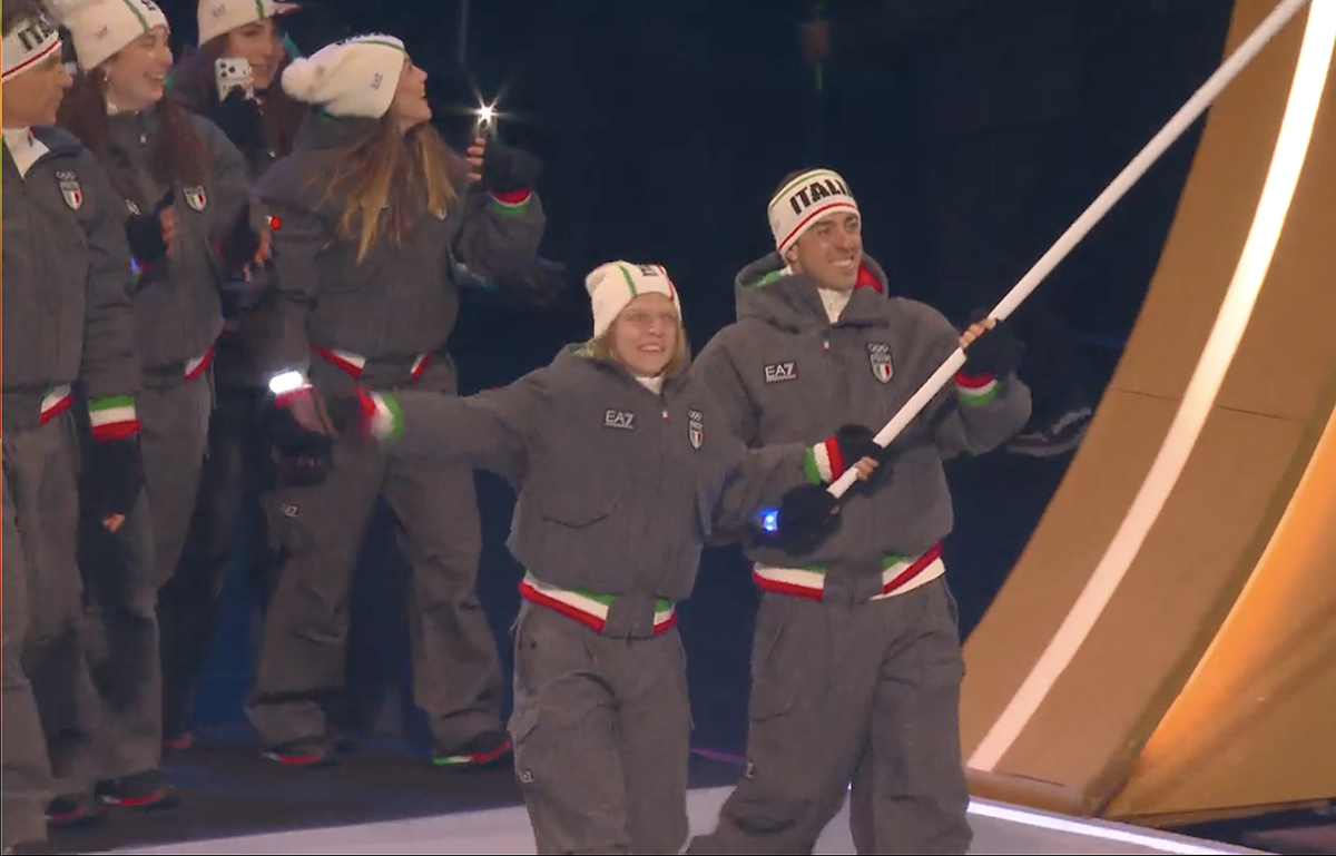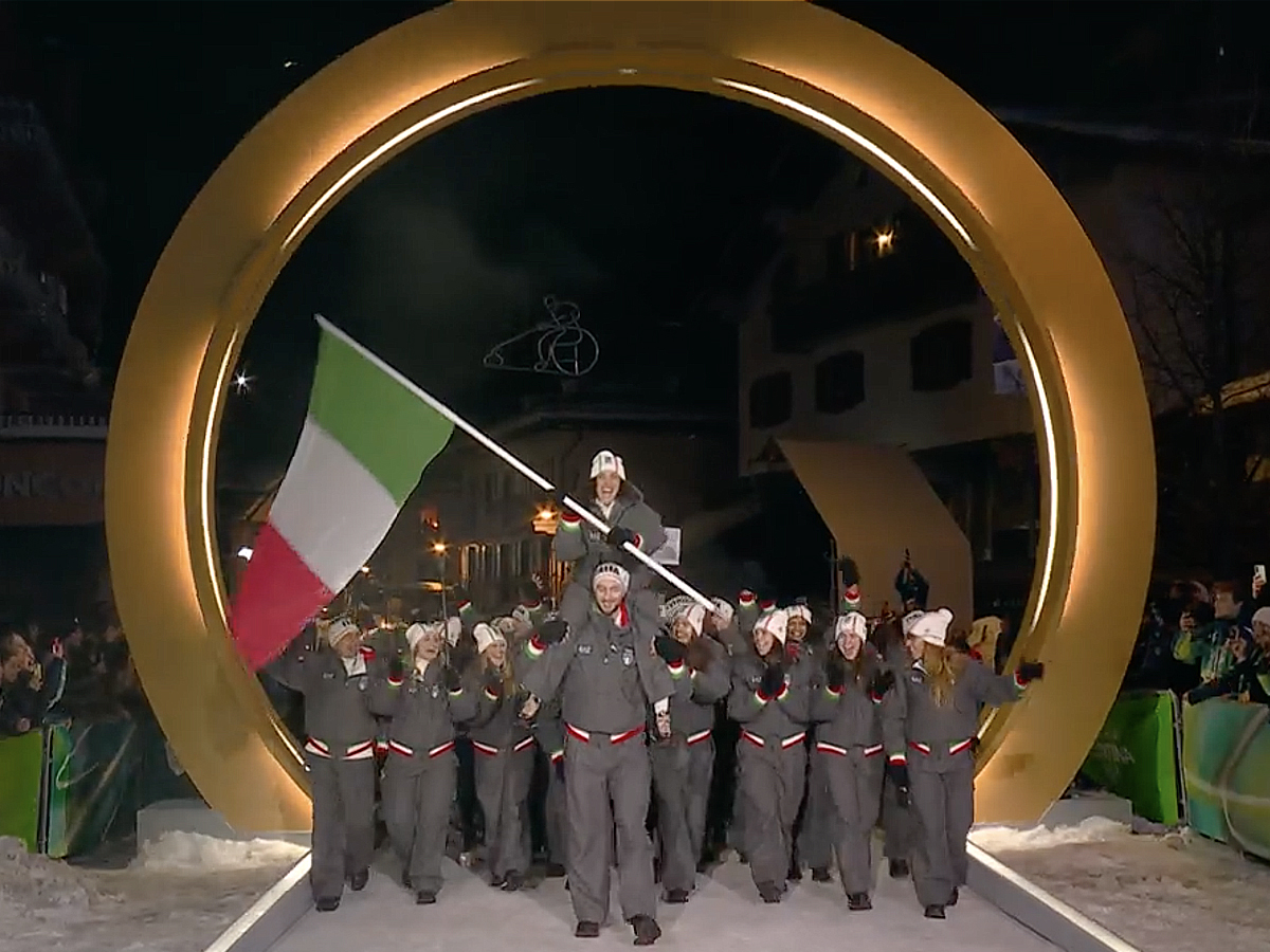 È il momento della nostra bandiera. Entra nello stadio con una sfilata di modelle vestite da giorgio Armani. I Corazzieri dei Carabinieri la prendono in consegna., La stessa scena avviene a Cortina. Qui la bandiera è tenuta tra le mani di Carabiniere donne!