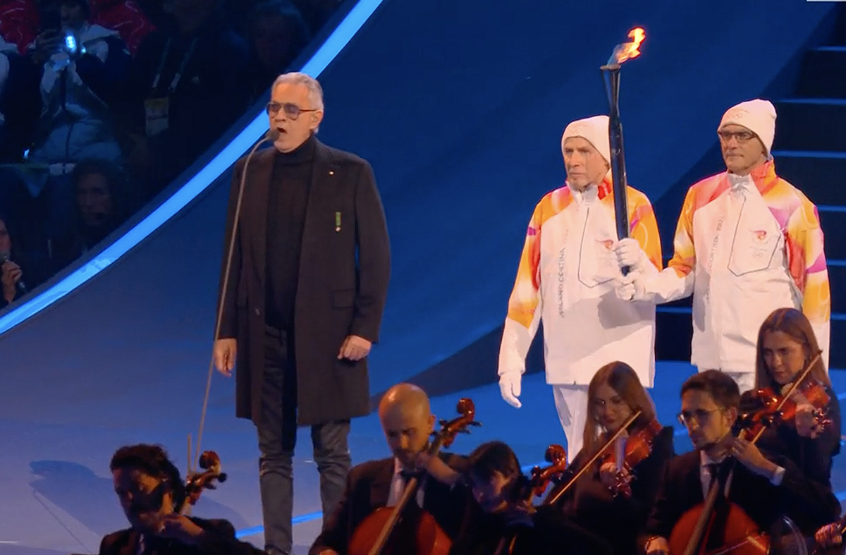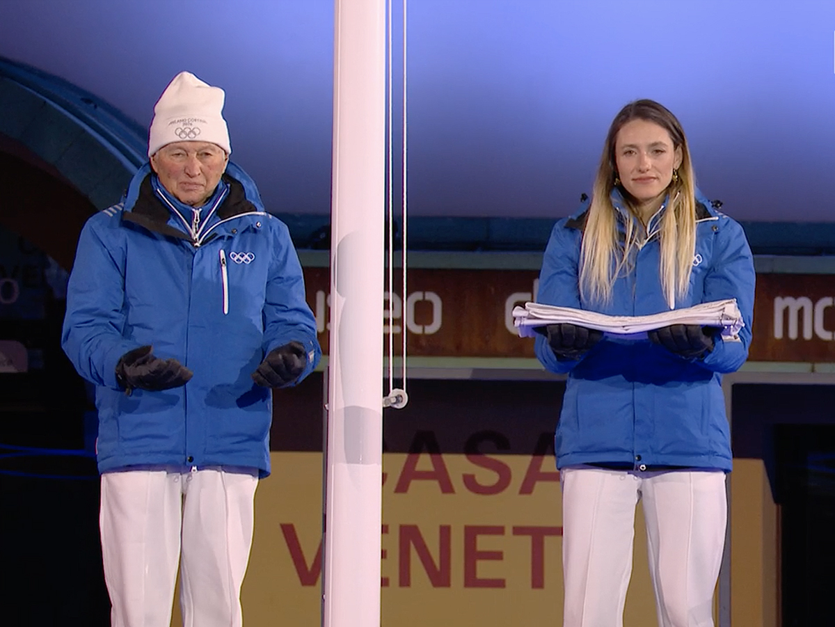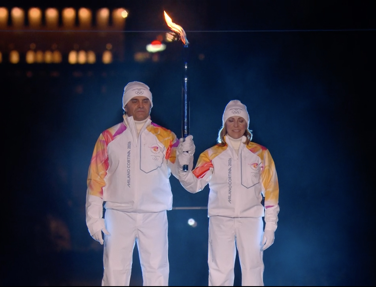 Dopo il passaggio degli ambasciatori di pace, la cerimonia si sdoppia simbolicamente tra Milano e Cortina. Sulle Dolomiti entrano in scena Franco Nones e Martina Valcepina, chiamati a replicare il gesto solenne già compiuto a San Siro. Nones, primo campione olimpico italiano della storia nello sci di fondo, e Valcepina, riferimento assoluto del pattinaggio di velocità su pista corta, incarnano il legame tra memoria e presente dello sport azzurro.