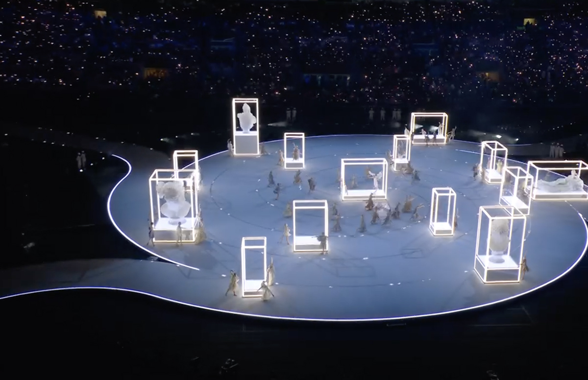Il ritmo scende, la narrazione si fa più meditativa: poesia e violino si intrecciano, incarnati da Francesco Favino e da un giovane violinista, mentre L’Infinito di Giacomo Leopardi risuona nell’arena. La cerimonia qui disegna un passaggio simbolico potentissimo: dal corpo alla mente, dall’individuale al collettivo. La danza accompagna la comparsa dei cinque cerchi olimpici, icona di inclusione e appartenenza globale. (Episodio già elaborato)