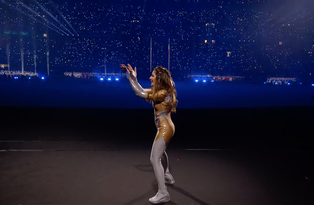 Dentro questo flusso si inserisce la performance di Sabrina Impacciatore, che accompagna il racconto con musica e interpretazione, trasformando la storia olimpica in narrazione emotiva, tra citazioni, atmosfere e riferimenti alla cultura pop italiana. Gli abiti, le luci, i suoni seguono le epoche: colori fluo, neon, richiami agli anni Ottanta, fino a tornare progressivamente al presente. È un secolo che si chiude per riaprirsi, pronto a consegnarsi a Milano-Cortina.