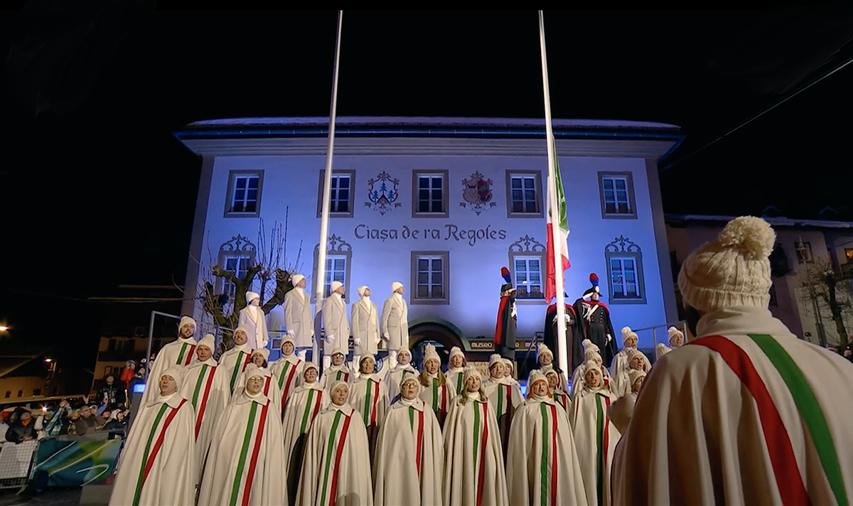 Alle loro spalle, a Cortina, la Casa delle Regole — edificio simbolo, sede di un’istituzione millenaria ancora attiva — diventa quinta ideale del rito. È un richiamo preciso alla continuità tra comunità, territorio e responsabilità: la bandiera olimpica viene consegnata e preparata per l’alzabandiera, mentre la scena si carica di un silenzio d’attesa.