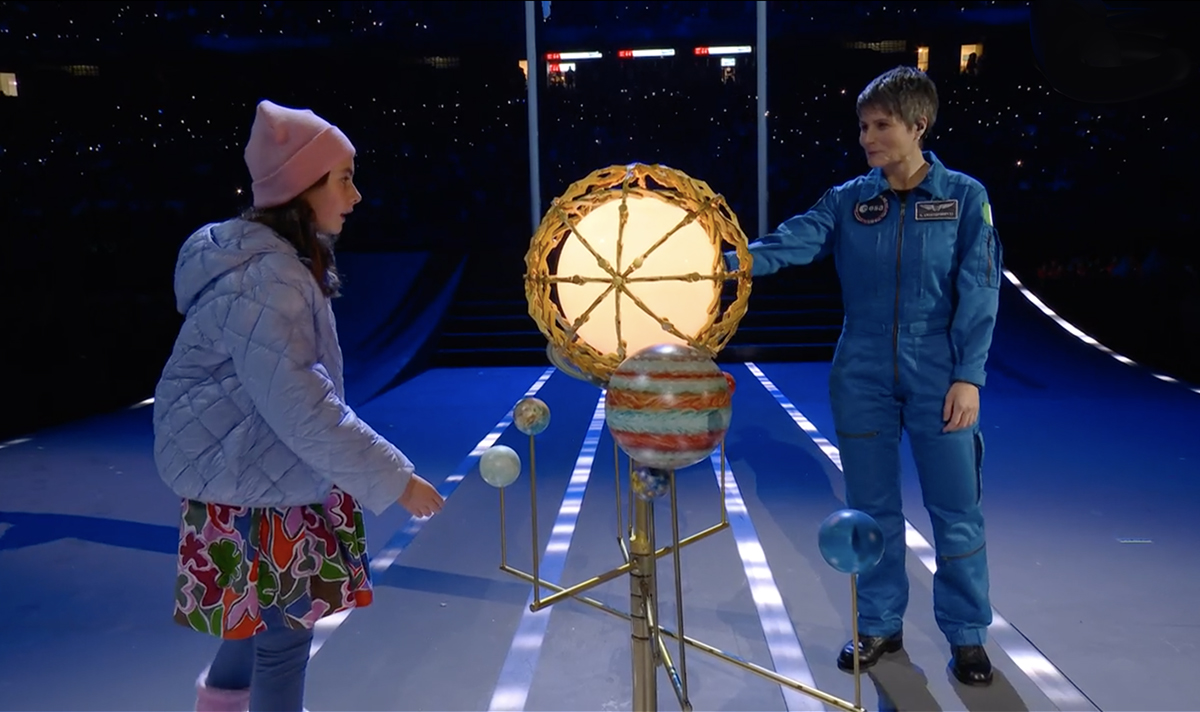 Il racconto visivo allarga lo sguardo: non più solo Milano o Cortina, ma l’Italia che si apre al mondo. In scena compare Samantha Cristoforetti, che attraversa il palco tenendo una bambina per mano. È un’immagine limpida: il futuro che accompagna il presente, la conoscenza che si trasmette, la curiosità che non si spegne. La cerimonia dichiara così la sua direzione finale: andare oltre i confini fisici, culturali, generazionali.