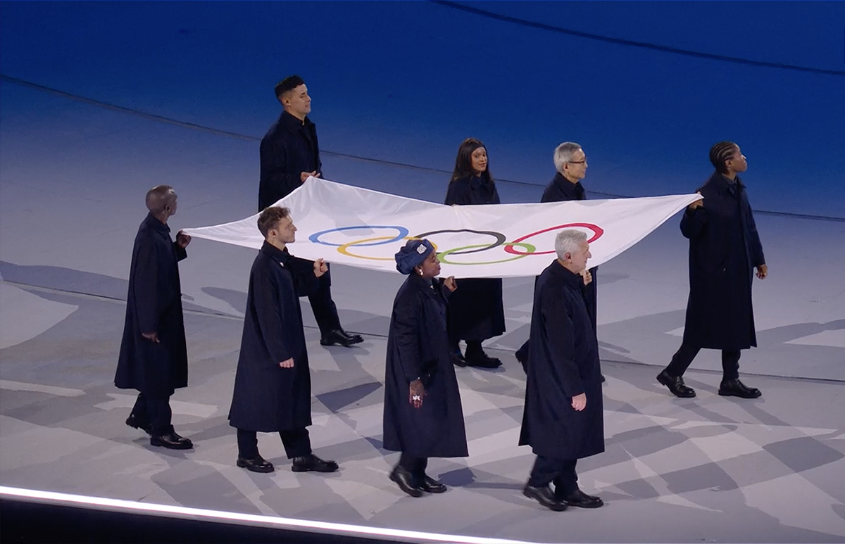 A questo punto la scena si fa solenne: entra la bandiera olimpica, accolta dall’inno. A portarla sono otto messaggeri di pace, figure che incarnano impegno civile, sportivo e umanitario. Tra loro Filippo Grandi, simbolo della protezione delle persone costrette a fuggire dalle proprie case; Cindy Ngamba, prima atleta del Team Olimpico dei Rifugiati a vincere una medaglia; Rebecca Andrade, icona di resilienza; Eliud Kipchoge, campione olimpico e ambasciatore UNESCO per i valori dello sport. Con loro anche personalità impegnate nel disarmo nucleare, nella tutela dei diritti umani, dell’ambiente e dell’uguaglianza di genere.