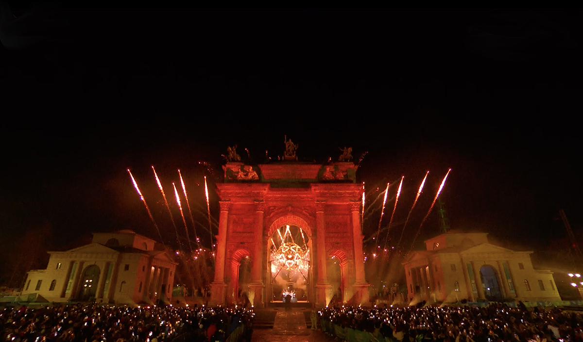 La cerimonia entra nel tempo cosmico del finale, quello in cui i simboli smettono di raccontare e iniziano a accendere. La scena si costruisce attorno alla luce: un sole artificiale prende vita, richiama il firmamento, disegna sfere in movimento che trasformano San Siro in una galassia viva, una Via Lattea che si espande oltre lo stadio. È un omaggio esplicito alla conoscenza, alla scienza, all’ingegno umano, evocato anche attraverso il nome di Margherita Hack, celebrata a Milano con una statua e qui richiamata idealmente nel momento in cui il fuoco sta per nascere.