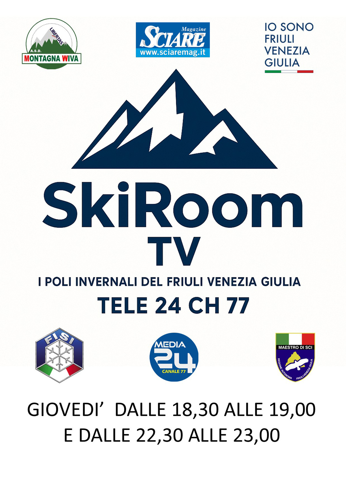 Dal 13 novembre, per sei giovedì consecutivi, Skiroom TV riporta la magia della montagna in televisione, con due appuntamenti settimanali su Canale 77 e Tele Venezia (18.30 e 22.30).