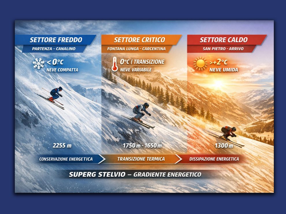 Sulla Pista Stelvio di Bormio oggi il SuperG non si correrà su una pista uniforme. Si correrà dentro un gradiente ambientale che cambia lungo il tracciato.