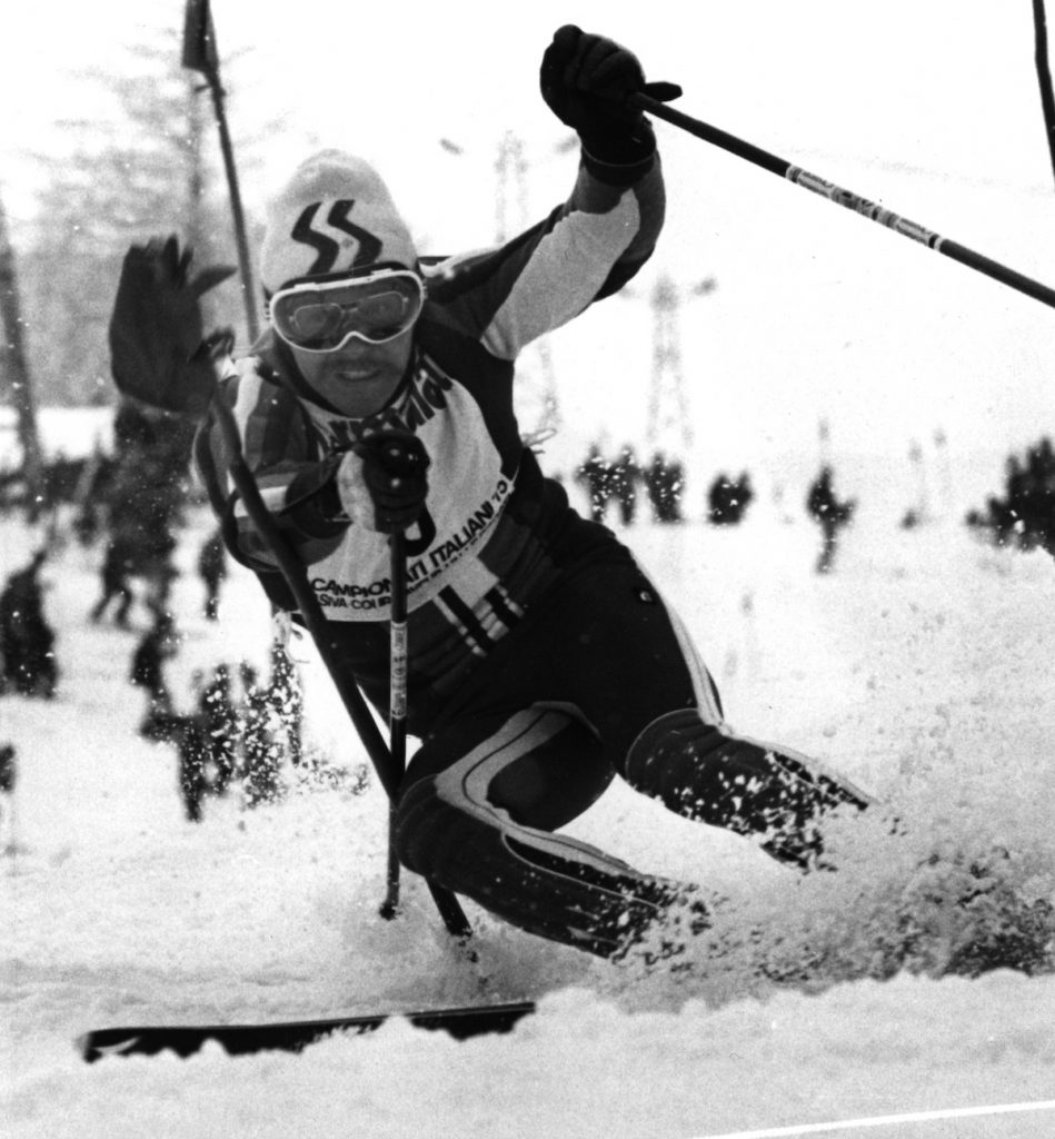 Quando c’è nebbia, o peggio ancora quando nevica, Tino, come un pipistrello, effettua un volo cieco. Eppure riesce perfino a fare dei risultati. Nel ‘75, ad esempio, ottiene un brillantissimo secondo posto nello slalom di Mayrhofen, alle spalle del più forte slalomista austriaco Hauser.