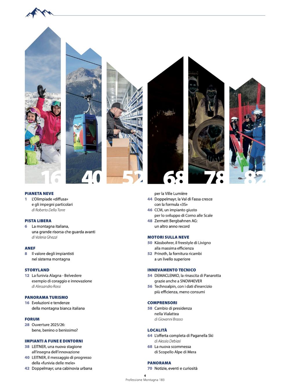 Il numero 183 (gennaio/febbraio 2026) di «professione Montagna», organo ufficiale dell’ANEF (Associazione Nazionale Esercenti Funiviari), si apre con l’editoriale di Roberto Della Torre che saluta l’importanza delle Olimpiadi Invernali di Milano Cortina per l’immagine di tutta la montagna italiana nel mondo e sottolinea il suo carattere di «organizzazione diffusa», mettendo in rilievo gli impegni particolari delle località coinvolte nella programmazione delle gare.