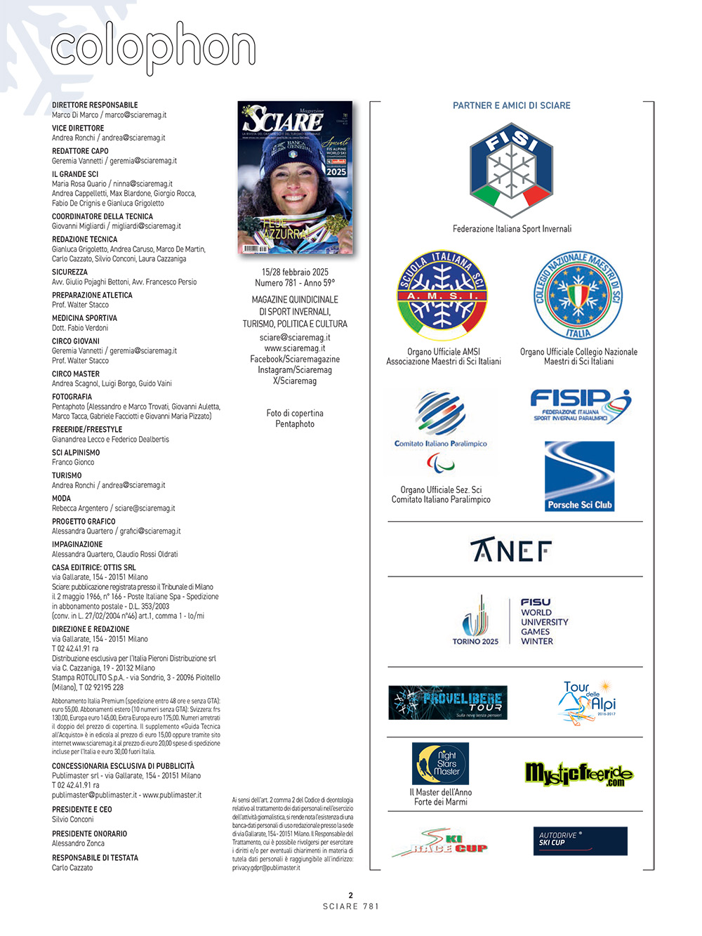 L’agonismo è gestito da Maria Rosa Quario (ninna@sciaremag.it), in arte Ninna, protagonista della Valanga Rosa tra il ’79 e l ’86 come slalomista. Madre di Federica Brignone, una delle nostre numero uno della squadra Azzurra, dirige anche le prove degli sci Junior. Intervengono anche Max Blardone e Denise Karbon,