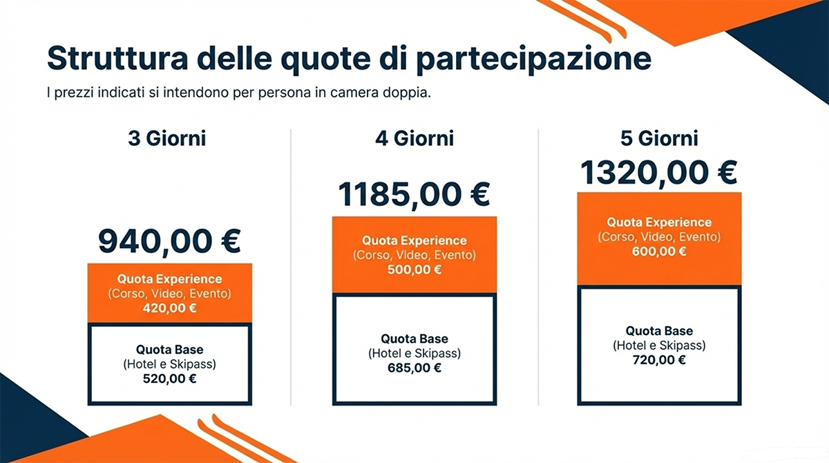 La quota di partecipazione sono diverse in base al periodo scelto. Eccole riassunte in questa immagine. Per ogni altra informazione e prenotazione: www.sciarecampus.it – info@sciarecampus.it – Tel. 348.3368688.