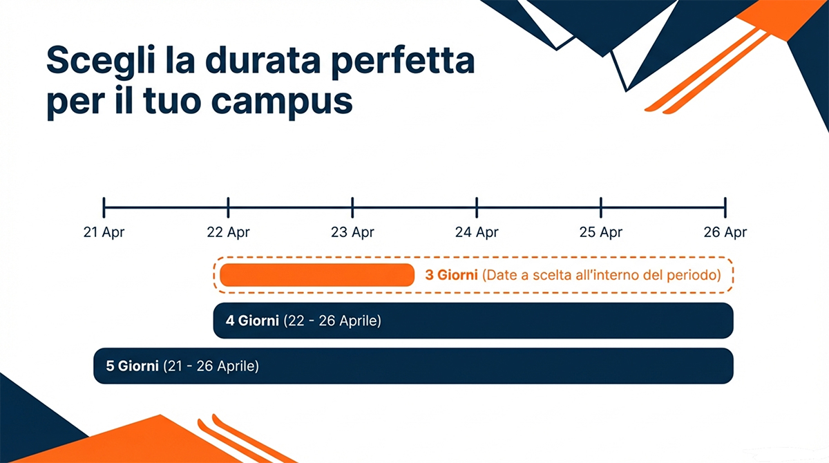 Ci sono diverse formule per questo periodo per accontentare le diverse esigenze: 3, 4 o 5 giorni. Dal 22 al 25 (3 giorni di lezione); dal 23 al 26 (3 giorni di lezione), dal 22 al 26 (4 giorni di lezione), dal 21 al 26 (5 giorni di lezione) o dal 21 al 26 (5 giorni di sci, 4 di lezione).