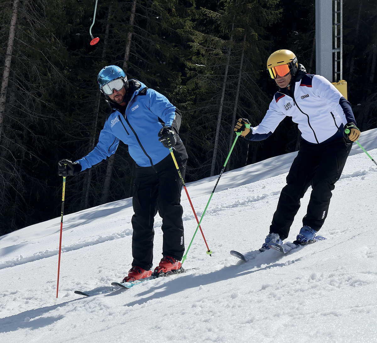 Loris Bonelli e Alfonso Trilli dimostrano la gestione e la diminuzione della presa di spigolo dalla massima pendenza in poi, dove l’inclinazione del pendio gi‡ da sola crea presa di spigolo