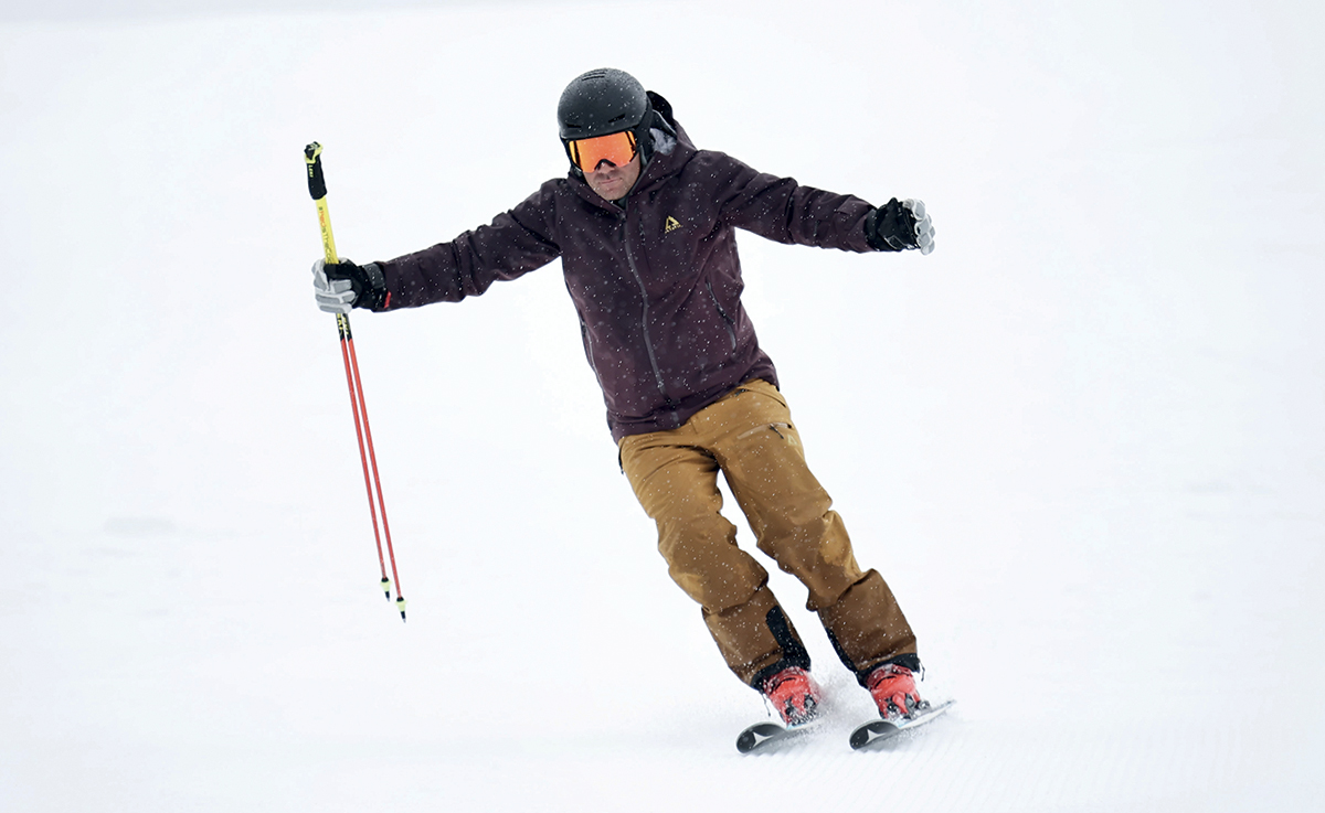 Come utilizzare allora lo sci interno in questa condizione? Qui la sua funzione è di stabilizzatore: aiuta a mantenere la centralità e a gestire lo sforzo muscolare, mentre lo sci esterno resta il principale responsabile nel limitare lo sbandamento laterale. Consiglio: mantenete sempre lo sci interno a contatto con la neve, con un leggero carico. Portate lo scarpone interno sotto al bacino, in modo che la caviglia si chiuda e la pressione sulla linguetta aumenti. Questo vi permetterà di sentirlo più preciso e sotto controllo.
