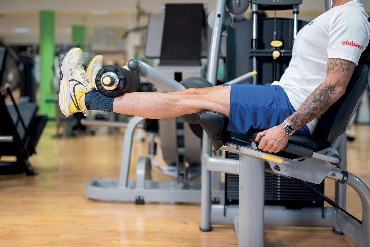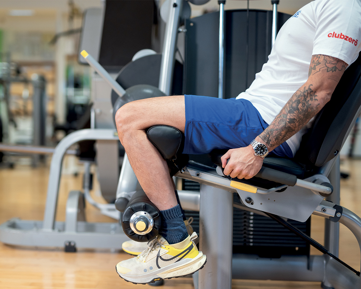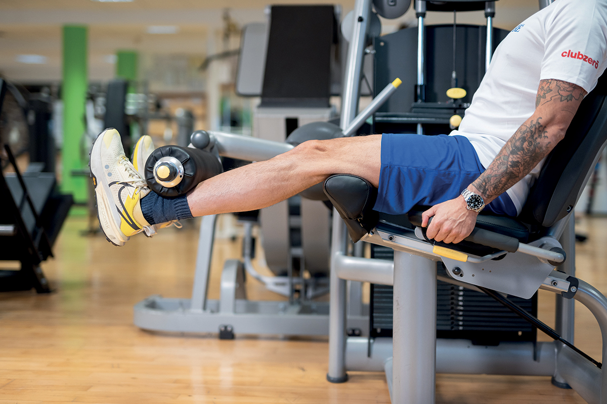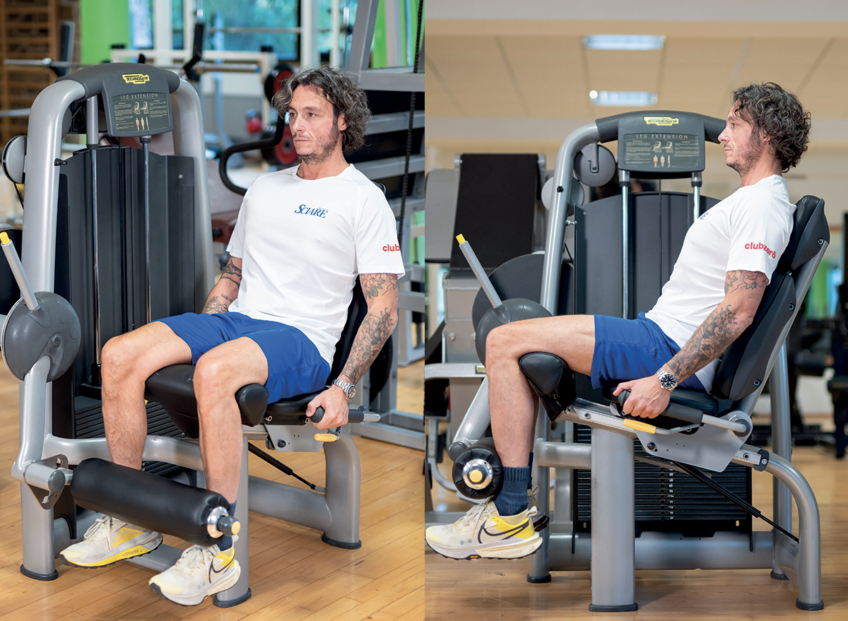 Daniele Marini, categoria Master, nelle due foto dimostra il corretto set-up. Seduto con il bacino a contatto dello schienale, presa delle mani sulle apposite maniglie, asse di rotazione del ginocchio in linea con quello della macchina, cuscino di appoggio posto al di sopra dell’articolazione tibio-tarsica e posizione di partenza con un angolo di 9o° tra coscia e gamba.