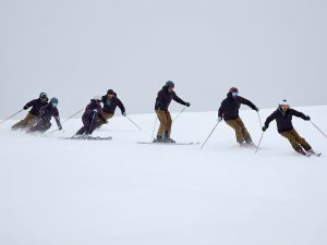 Questo movimento «muscolarmente» interessa l’ampia zona anteriore della coscia dell’arto inferiore che si identifica specialmente nel muscolo quadricipite femorale. Questo muscolo è tra i più utilizzati – o per lo meno presunto tale – nell’azione tecnica dello sci alpino. Chi, al termine di una discesa «tirata» non ha mai esclamato: «Mi bruciano le gambe», identificando nella zona anteriore della coscia il principale punto di dolore? E se proprio questo non è mai capitato, o non sono uno sciatore accanito, basta vedere l’arrivo di una delle tante gare di sci per notare atleti stremati, che alla fine della gara, si piegano in avanti toccandosi tale parte del corpo.