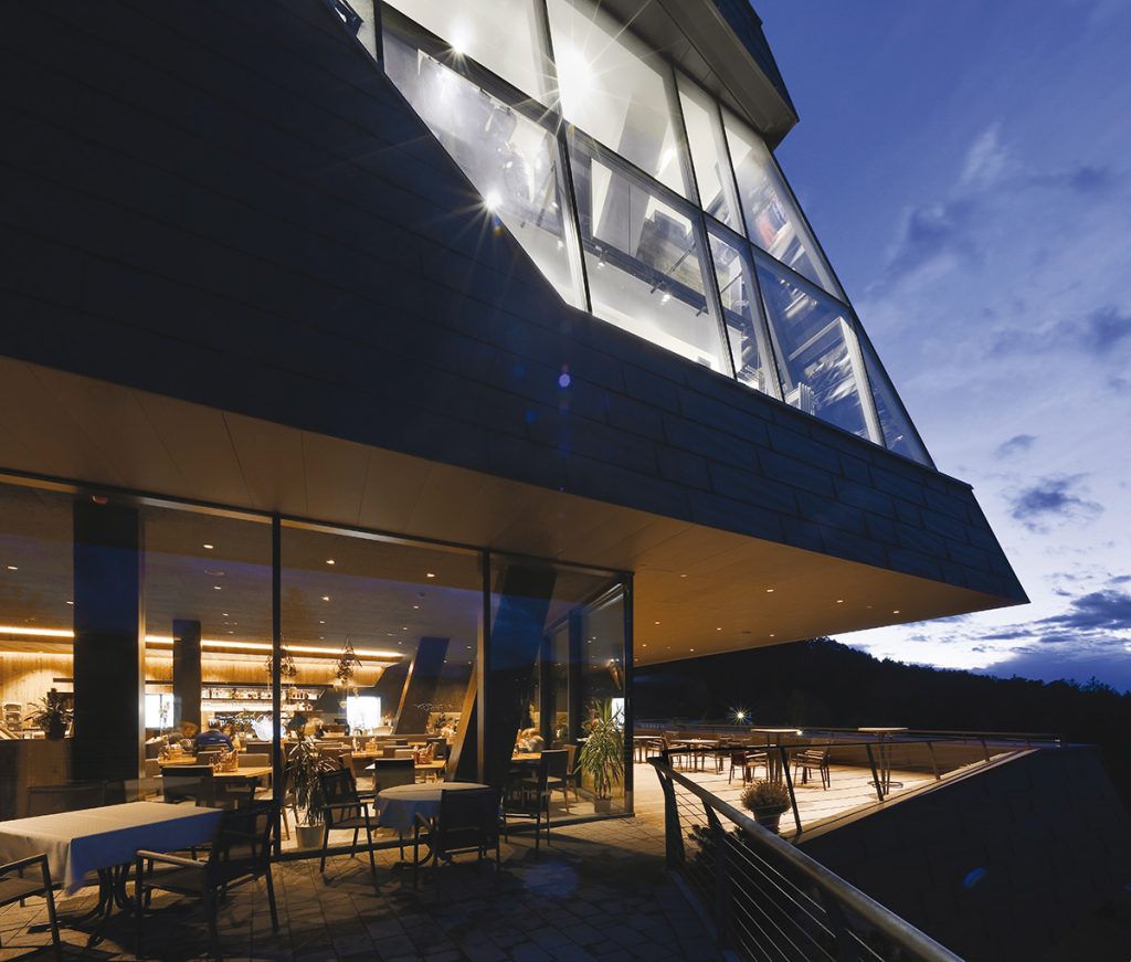 Il volume monolitico è coperto da panelli di alluminio colorati con una tinta scura che lo fa sembrare una propaggine di pietra che esce dalla montagna.