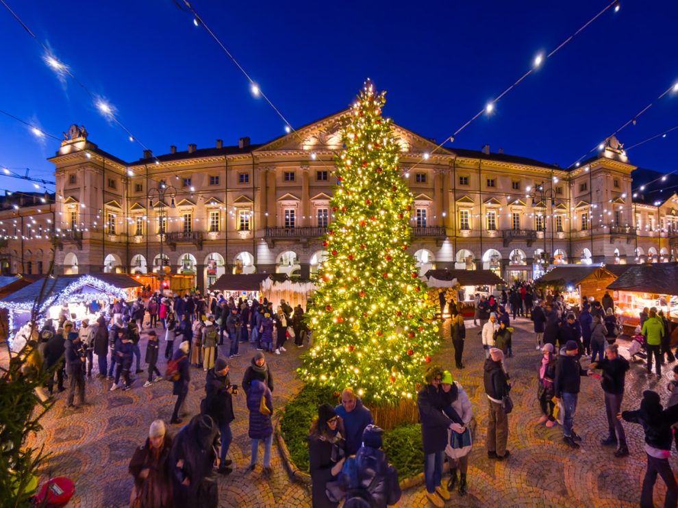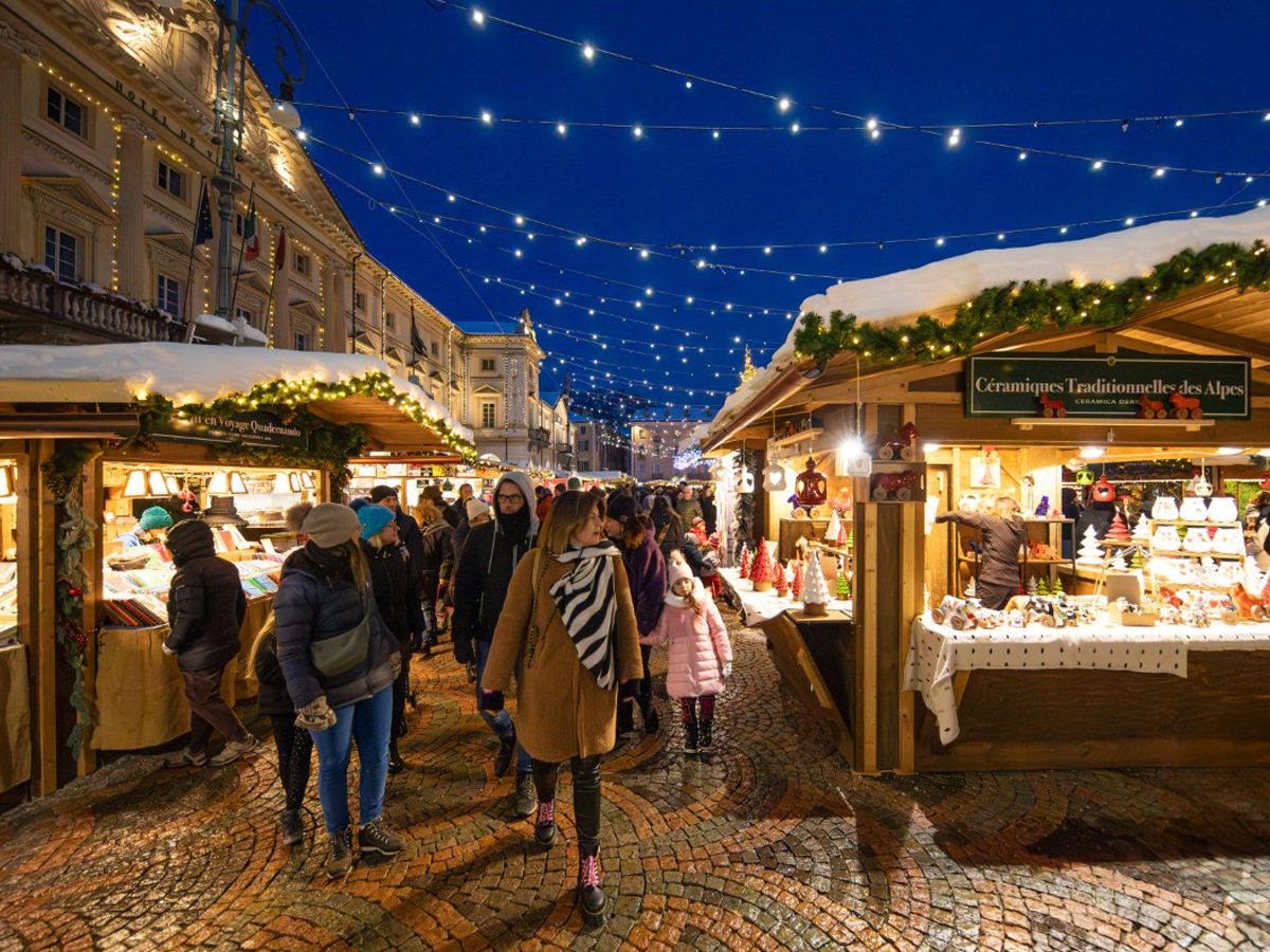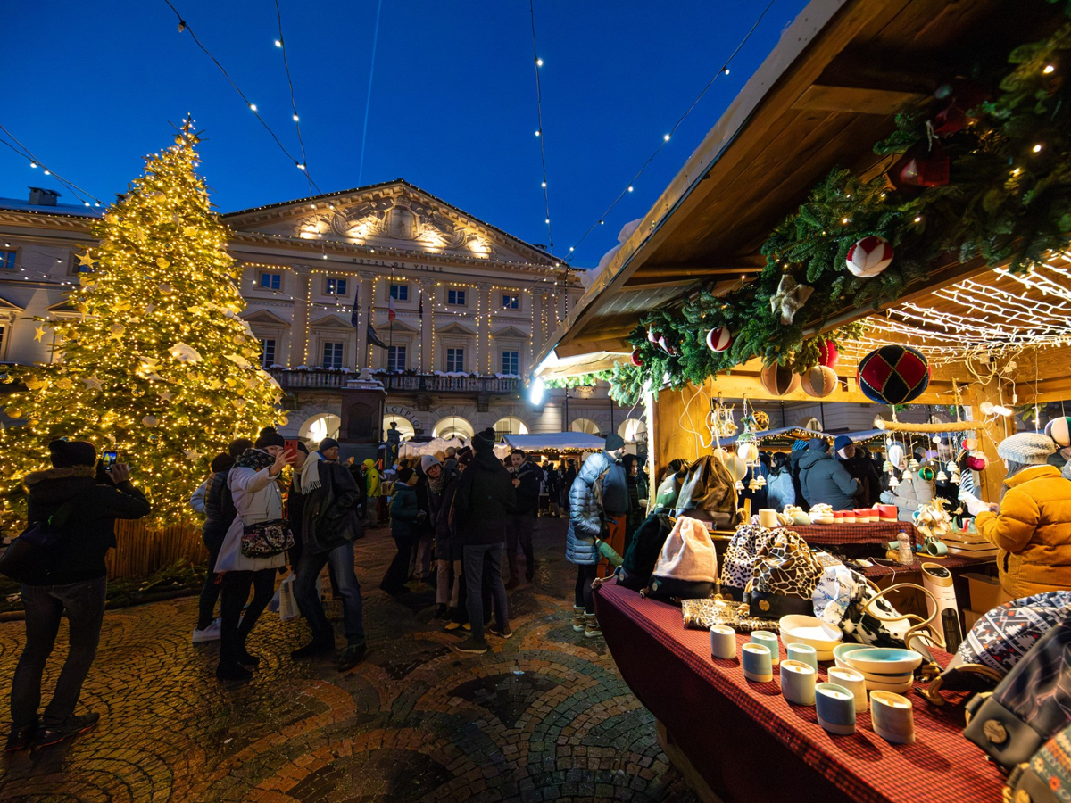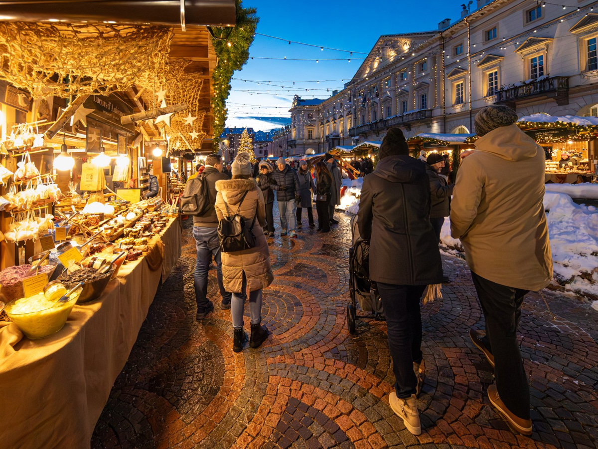 In inverno Aosta cambia passo. Il centro storico si stringe, le luci si accendono come un respiro lento, e Piazza Chanoux — il cuore elegante della città — diventa qualcos’altro: un piccolo villaggio alpino sospeso tra legno, profumi, musica e quella nostalgia buona che il Natale sa accendere senza chiedere permesso.