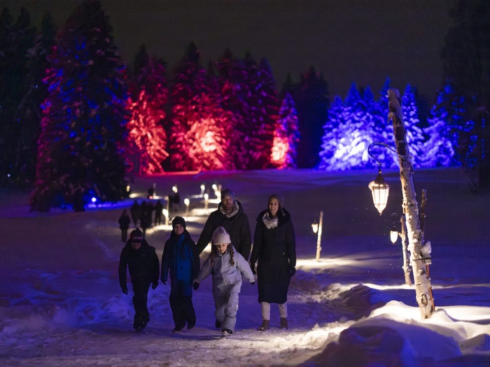 Si percorrono circa 2 km — un itinerario facile, di circa 45 minuti — immersi in un bosco illuminato da lanterne che creano un’atmosfera dolce, ovattata: la neve scricchiola sotto i passi, gli alberi innevati si stagliano nella notte, la luce tenue invita alla contemplazione.