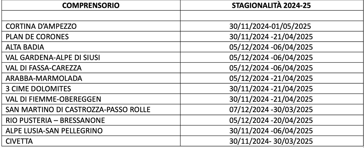 La stessa avrà tradizionalmente inizio l’ultimo sabato di novembre, ovvero il 30/11/2024, con prime aperture in 6 comprensori. Come ogni anno, a seconda delle condizioni meteo e di innevamento, singoli impianti potranno iniziare la stagione già qualche giorno prima. Qui di seguito la panoramica completa delle stagionalità nei 12 comprensori di Dolomiti Superski per la stagione 2024-25: