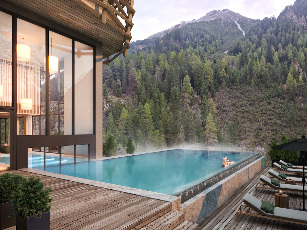 La piscina a sfioro si apre verso il Canyon del Trafoi come una terrazza sospesa, mentre una grande vetrata panoramica incornicia le vette. L’esperienza è immersiva: acqua, cielo e montagne si fondono in un unico orizzonte.