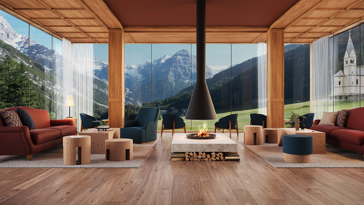 Il primo intervento, completato a dicembre 2025, ha visto la realizzazione del lounge bar con camino “Home of Gold”, uno spazio che celebra la storia sportiva di Gustav Thöni e della leggendaria “Valanga Azzurra”. Contestualmente è stata rinnovata la reception, concepita come elemento di connessione tra passato e futuro.