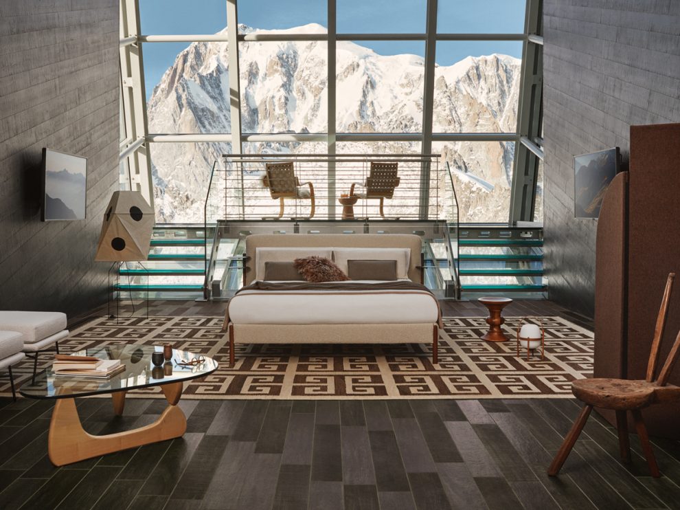 La Suite Skyway Monte Bianco, accessibile anche a persone con mobilità ridotta e arredata con elementi di design come la lampada da terra Akari di Vitra, la coppia di Easy-chairs progettate da Alvar Aalto, le sedute di Arflex e il tappeto Kilim di Amini, è stata studiata per dare risalto all’elemento protagonista della stanza. La vetrata di quasi 50 metri quadrati che incornicia il Monte Bianco.
