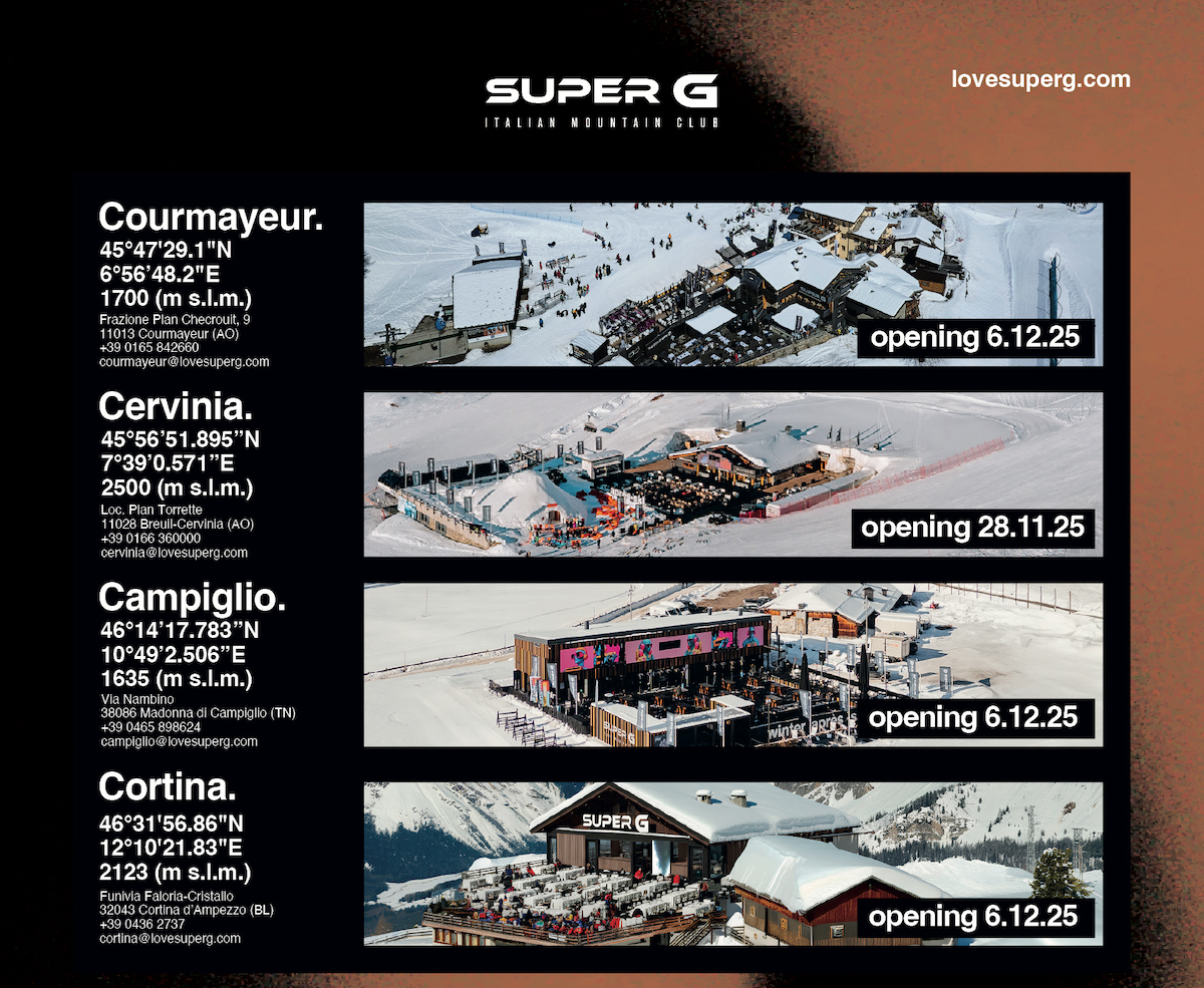 «Con la stagione invernale 2025/26 – ha dichiarato Baccuini – Super G consolida il suo ruolo di prima catena di mountain club delle Alpi italiane. Il nostro format evolve: più musica, più contaminazioni tra ospitalità, intrattenimento, ristorazione ed eventi corporate. La montagna è il nostro palcoscenico naturale».