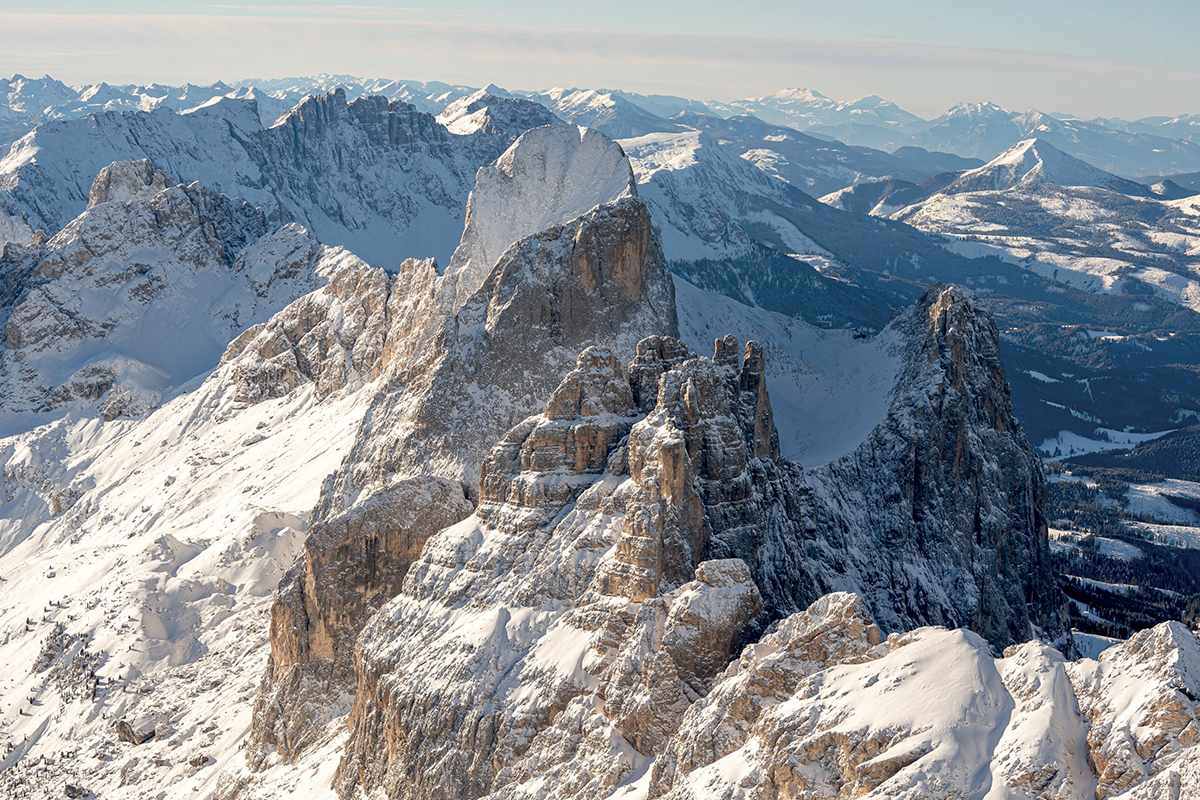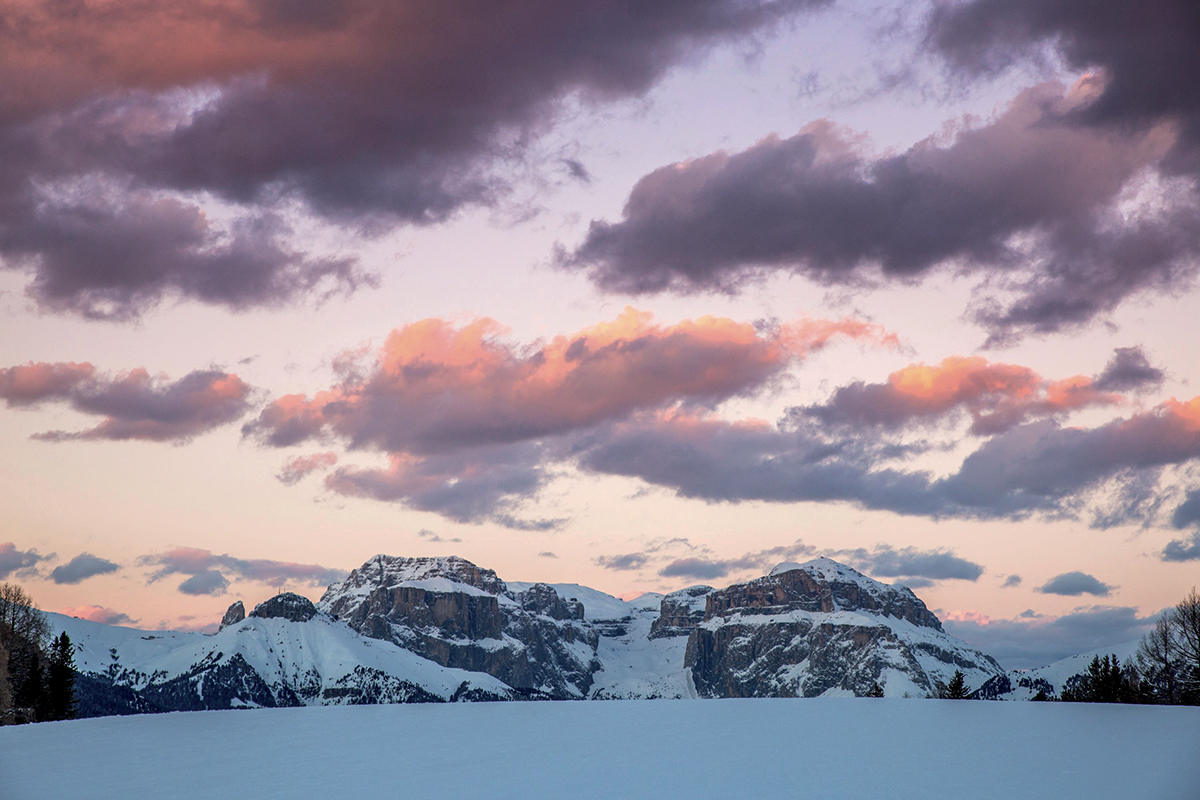 Il Catinaccio, con i tramonti che incendiano le sue torri. Il Sella, che domina l’intero arco dolomitico come un castello di pietra. Il San Pellegrino, che al calar del sole riflette il rosa più dolce del mondo. E in mezzo, la vita: i paesi ladini che conservano la loro identità, il ritmo del tempo e quel senso di misura che in montagna è una forma di saggezza.